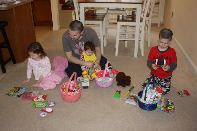 On Easter morning we always come down, check out what the Easter Bunny left in their baskets and then we find the eggs we dyed that the Easter Bunny hid.